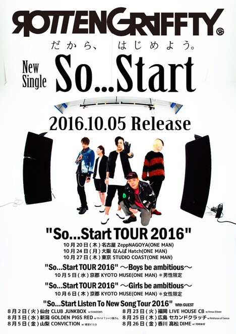 なおバンドは本作に関連したライブツアー「So…Start Tour 2016」を8月より実施。ツアーは、新曲のお披露目を目的にした「So…Start Listen To New Song Tour 2016」、男性限定ライブ「Boys be ambitious」、女性限定ライブ「Girls be ambitious」、東名阪ワンマン「So…Start Tour 2016」で構成される。「So…Start Listen To New Song Tour 2016」は対バンライブで、競演者として