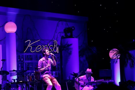 3年ぶりの七夕開催となった「Ken's Bar」。今回はリゾートホテルにあるバーを模したトロピカルなムード満載のステージが用意された。平井は冒頭で「思いがかさなるその前に…」「君の好きなとこ」を披露すると、「『Ken's Bar」へようこそ! 平日の幕張、アクセスの大変なところへいっぱいいっぱい来ていただいて、ありがとうございます。うれしゅうございます」と挨拶する。続けて「今日は皆さんもご存じのとおり七夕でございまして、今宵は僕が歌の彦星として皆さんに命がけで愛を届けようと思います。受け止めてくれるかな、磯の香り幕張ボーイズ&ガールズ!」とオーディエンスを煽った。