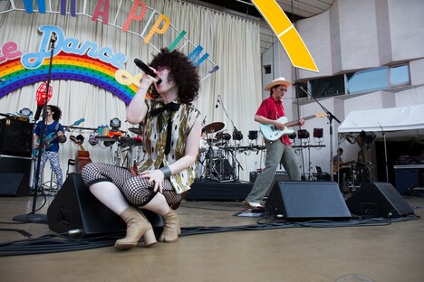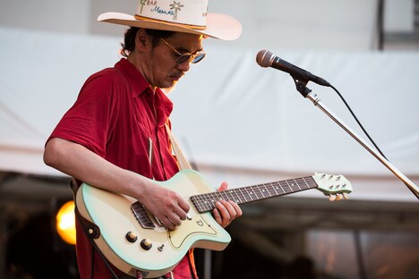 バンドの面々は、おなじみの入場SEであるSly & The Family Stoneの「Dance to the Music」を合図に次々とステージに登場。それからスカアレンジの「CAST YOUR FATE TO THE WIND」で鍵盤ハーモニカを牧歌的に響かせてライブをスタートさせた。森が「今日は3時間くらいやらしてもらいますんで」と宣言した最初のMCのあとには、「Sundance」「Whammy Kiss」など攻撃的なギターサウンドが魅力の楽曲群が次々と繰り出されていく。さらにダンサブルなIan Dury & The Blockheadsの「Inbetweenies」のカバーで会場の熱気が高まったところで、バンドはソフトなダブポップチューン「レモン」をひさびさにライブでプレイ。浮遊感あるシンセやホーンサウンドと伸びやかな歌声で、野外に相応しいロケーションを生み出していった。