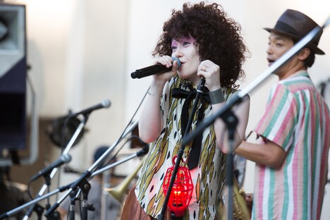 中納と森の2人で届けたボサノバチューン「満ち汐のロマンス」や、静かなギターアルペジオとセミの鳴き声が美しく夕暮れ時を演出した「Fall」など、しっとりとした楽曲を続けてオーディエンスをクールダウンさせたあとには、中納以外のメンバーでPrince Buster's All Starsの「Ali Shuffle」をカバー。小気味よく刻まれる森のスカカッティングと迫力あるダブミックスにより会場は混沌とした雰囲気へと誘われていった。その熱演の余韻も冷めやらぬ中、ステージ下手に姿を現した中納がドラを1発打ち鳴らす。これを合図にバンドはきらめくようなホーンサウンドと疾走感が魅力の「Mother Ship」を繰り出して、後半戦のスタートを華々しく彩った。