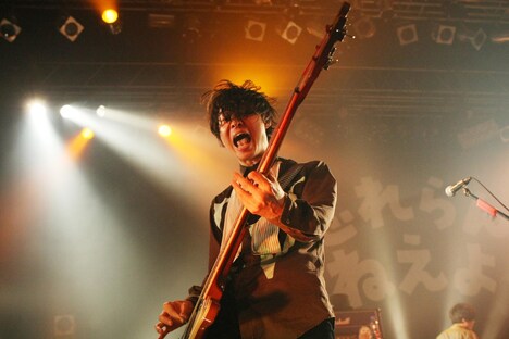続く「戦う時はひとりだ」「僕らパンクロックで生きていくんだ」で、いきなりフロアを熱狂の渦に包むと、柴田は満面の笑みで「これもう勝ちでしょ」「もうビール飲みたいもん」と、この日のライブに太鼓判を押すも好事魔多し。「友達のバンドがみんな『最初のZeppは絶対失敗しますよ』って言ってたけど、そんなことないじゃん」と豪語した直後、バンドはマシータのカウントと同時に「僕らチェンジザワールド」をスタートしようとするが、柴田は見事に出とちり、梅津から「失敗してるじゃん!」とツッコまれてしまう。しかしこれに苦笑いの柴田は、梅津、マシータ、そしてもう1人のサポートメンバー・ロマンチック☆安田(G, Key /