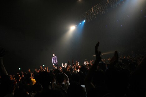 開演時間を迎え、客電が落ちた刹那に流れてきたのは、なぜか[Alexandros]の「ワタリドリ」。この曲をBGMにフロア最後方、PA卓の前に1人姿を現した柴田隆浩(Vo, G)は遠く前方を指さしながら「“ワタリドリ”のようにあそこまで運んでもらっていいですか?」とZepp DiverCity TOKYOの端から端までクラウドサーフで送られながらステージへとなだれ込む。そして、そこに待つ梅津拓也(B)とサポートドラマー・マシータと共にそれぞれ自身の身体で「S」「E」「X」の人文字を作ってジャンプする“SEXジャンプ”をキメたのち「やっぱ1曲目はこれっしょ」と「バンドワゴン」を投下した。