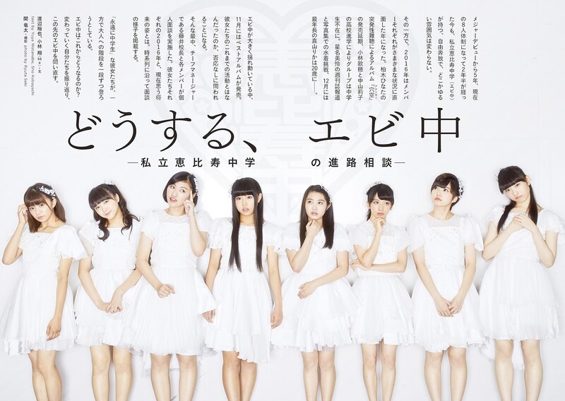 「どうする、エビ中 -私立恵比寿中学の進路相談-」と題した特集では、エビ中の“校長”こと藤井ユーイチチーフマネージャーがメンバー全員へ個人面談を実施。8人は11月16日に「『中卒』~エビ中のイケイケベスト~」「『中辛』~エビ中のワクワクベスト~」という2枚のベストアルバムのリリースを控えるのみならず、柏木ひなたの突発性難聴によるアルバム「穴空」の発売延期や小林歌穂と中山莉子の高校進学、星名美怜の写真集発売と週刊誌報道など、グループにとってさまざまな出来事が起こった2016年を踏まえ、現在の胸中や今後についてを語る。なおエビ中は今号の裏表紙にも登場。