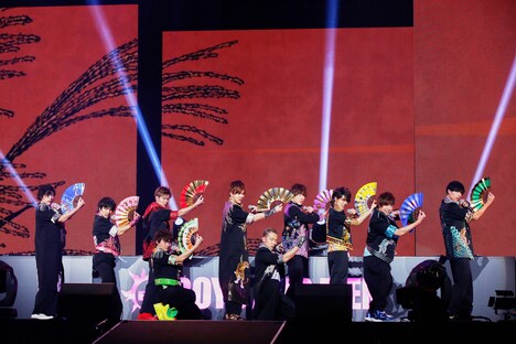 オープニングナンバーは「男は歌舞いて花となれ」。続いて「グッジョブ!ムチューマン」「ヤンファイソーレ」とアッパーチューンが次々と披露され、会場の熱気は急上昇する。「Fight & Fire」ではメンバー全員がステージ中央の花道に進み出て、力強く自己紹介した。「なごやめしのうた」でメンバーのバックに登場したのはチアガール姿の研究生たち。キュートでパワフルなダンスに、客席からは笑いと拍手が起こっていた。