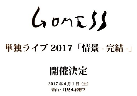 今回の公演は昨年4月発表のアルバム「情景 -前篇-」および12月発表のアルバム「情景 -後篇-」に続く、「情景」シリーズの完結篇として実施されるもの。GOMESSにとってワンマンライブは2015年4月の東京・代官山LIVE HOUSE LOOP公演以来、およそ2年ぶりとなる。ライブ当日はParanel、中尾有伽もゲストとして登場。今後もゲストは追加される。