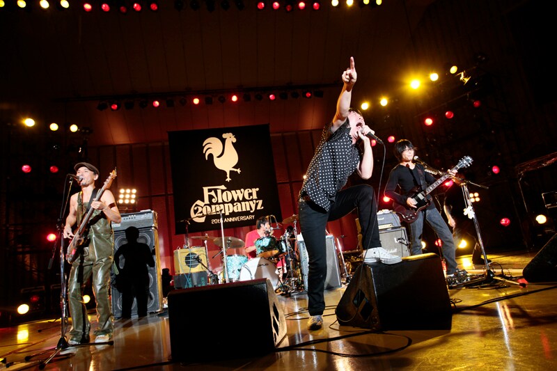 フラカンが野音のステージに立つのは1998年以来、実に11年ぶりのこと。彼らの20年間の歴史を総括するような内容となったライブは2時間半におよび、竹安堅一(G)による10分にわたるソロが繰り広げられた「夢の列車」や、カバー盤が発売された「深夜高速」などアンコールを含め23曲が披露された。その熱いパフォーマンスに集まった約3000人のファンは大興奮。小雨が降る中、思い思いの形でライブを楽しんだ。
