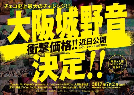 これまで東京・日比谷野外大音楽堂での野外ライブや東京・新木場STUDIO COASTでの対バンイベントなど、さまざまな形で実施されてきた「ドリームシャワー」。「Czecho No Republicのライブをどこの土地の人にも楽しんでもらいたい」というメンバーの思いから、今回初めて東京以外で開催される。なおチケット代は“衝撃価格”とのこと。詳細は追ってアナウンスされるので、続報もお楽しみに。