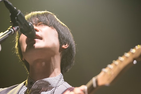 ファンの大歓声に迎えられたBase Ball Bearは、さわやかな「BREEEEZE GIRL」でライブをスタートさせる。堀之内大介(Dr, Cho)のカウントを合図にスポットライトを浴びた小出祐介(Vo, G)は、「senkou_hanabi」を歌唱しオーディエンスの目を釘付けに。曲中には弓木、関根史織(B, Cho)が向き合って演奏を届けた。MCで小出は来場者に感謝の気持ちを述べたあと、弓木を紹介。彼女が「(ツアー終わるの)寂しいですねー。めっちゃ寂しいです。あはは(笑)」と持ち前のマイペースな口調で笑うと、小出から「寂しさを微塵も感じさせないですね」とツッコまれ、場内からも笑いが起こった。