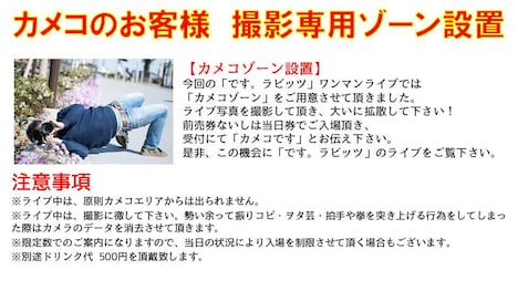また「カメコゾーン」はライブ写真を撮影したい人向けのゾーン。前売り券または当日券を購入のうえ、受付で「カメコです」と伝えると、「カメコゾーン」に案内される。ここでの観覧希望者は「ライブ中は、撮影に徹して下さい。勢い余って振りコピ・ヲタ芸・拍手や拳を突き上げる行為をしてしまった際はカメラのデータを消去させて頂きます」といった注意事項に留意して、撮影に集中しよう。