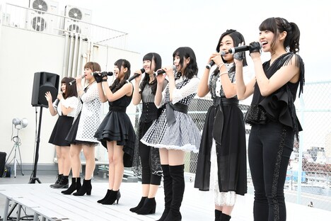 この日7人は撮影のため、4月27日に東京・AKIBAカルチャーズ劇場で行われる定期公演にてお披露目予定だった新衣装を着て登場。白と黒の衣装を身にまとった彼女たちは軽快なパフォーマンスで「じゃじゃ馬と呼ばないで」を全3回届け、最後のサビでは「せーので揺らせ!」の歌詞に合わせてファンがカメラを左右に振って動画を撮影した。