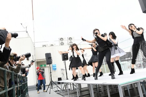 転校少女歌撃団が明日4月25日にニューシングル「この世界にサヨナラして」をリリース。4月22日に東京・新宿マルイ メン 屋上特設ステージにて本作のType-Cの収録曲「じゃじゃ馬と呼ばないで」のミュージックビデオの撮影イベントを行った。