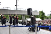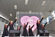 MCでひとしきり盛り上がったエビ中は、ここで「エビクラシー」の中から、ミュージックビデオも話題となった「感情電車」を披露。さらにもう1曲「エビクラシー」から、5月26日放送のテレビ朝日系「ミュージックステーション」出演時にも歌われた「なないろ」を熱唱し、お台場にさわやかな歌声を響かせた。最後は会場に集まったエビ中ファミリーと記念撮影を行い、ミニライブは終了。その後メンバーは「エビクラシー」購入者を対象とした握手会でファミリーとの交流を楽しんだ。