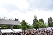 東京のイベント会場となったフェスティバル広場は、4月まで巨大な「機動戦士ガンダム」の実物大ガンダム像が立っていた場所。ガンダム像は解体され、跡地は現在整備工事の衝立に囲まれているが、昨日のイベントでは特設ステージ正面のエリアのみならず、衝立の後方にまで大勢のエビ中ファミリー(私立恵比寿中学ファンの総称)が詰めかけた。