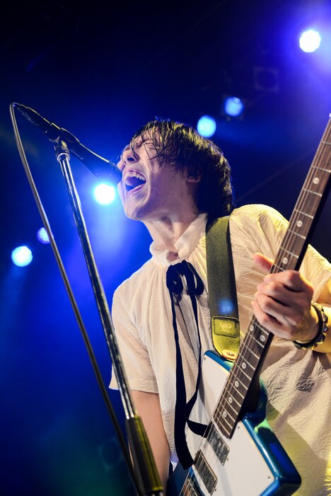 そんなバンドらしいパートを経て再び楽器を置いた3人は、アイドルよろしくキュートな声でメンバー紹介を始める。ここで下川は「こんなにたくさん来てくれてうれしい!」とかわいらしく喜びの声を上げるも、自身のアンプの上にコンドームが置かれていることに気付いて「私のアンプの上にコンドームを置いたの誰かしら?」とおもむろにフロアにコンドームを投げる。あまりに遠くに飛んで行ったコンドームを見ながら彼は、「私が川に延々石を投げてたスキルがここで発揮されちゃった……あれが負の遺産ね」と消沈。3人が気を取り直すように「☆君☆と☆メ☆タ☆モ☆る☆」で菅と共にキュートなダンスを踊ると、オーディエンスもコールしたり、サイリウムを揺らしたりと彼らのパフォーマンスを応援した。