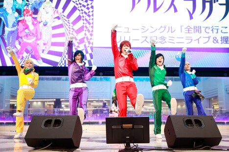 「敵はどこだ? 噴水広場のみんなは大丈夫か? 地球のメイト(アルスマグナファン)の平和は俺たちが守る!」とステージに登場したメンバーは、「全開で行こう」のカップリング曲「イレギュらレンジャー」をパフォーマンス。戦隊ヒーロー風の衣装に身を包み、軽やかなアクロバットを見せると、会場からは黄色い歓声が上がる。すると神生アキラは「サンシャインシティ噴水広場の平和は守れたぞ!」と満足顔を浮かべた。