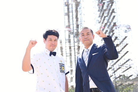 続いて報道陣の前に表れたのはタカアンドトシと樽美酒の2組。痛いほどの日差しが降り注ぐ環境でのチャレンジとなったことについて問われると、樽美酒は「寒いよりも暑いほうがいいんですよ! 冬は筋肉が硬直しちゃって、ほぐすのが大変なんです」と答えた。
