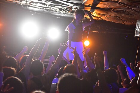 「高校生の頃に曲を聴いていた後藤まりこさんと曲が作れて、生きててよかった」と感慨深げに語ったのち、彼女は後藤との共作シングルから「はろー@にゅーわーるど」を、フロアに花びらを撒きながら歌唱した。「ロックンロールは死なない」では観客に一緒に歌うことを促すも、春はその声が小さいと一喝。「マジが足りないと思うんですよ! 音楽好きなんですよね? 本気で魂をぶつけに来たんですよね?」と叫んで、何度もストップをかけては歌い直し、最後は会場中で腕を振り上げて大合唱になった。