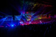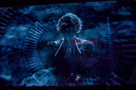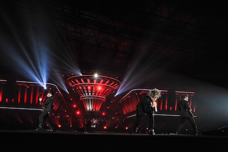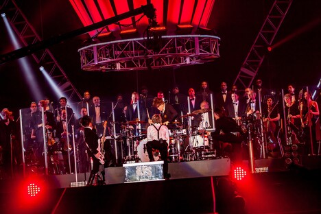 オープニングムービーの上映ののち、号砲と共にステージを覆っていた幕が降ろされると、そこにはオーケストラを従えたスーツ姿の4人の姿が。大歓声の中、バンドはオーケストラと共に「終焉レクイエム」でライブをスタートさせる。さらにHiro(Vo)が「声枯らす準備できてるな?」とファンを焚きつけてからバンドは「ALONE」へ。会場から掛け声が上がる中、Hiroはスタンディングエリアの真ん中へ延びる花道に進んで歌唱。Teru(G)とNob(B)はステージの左右へと延びる花道へ進むなど、4人は大きな会場をめいっぱい使って、ライブを進行していった。