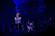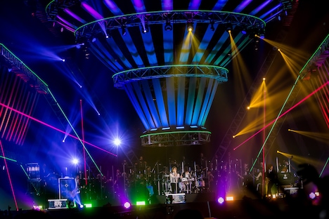 ステージには大掛かりなセットが用意され、ファイヤーボールが上がったり、色とりどりのレーザーが会場を彩ったりと、ダイナミックな演出が施されたこの日。「失踪FLAME」では幕が下がり、紗幕に映像が映し出される中、幕の奥でメンバーが演奏を聴かせるという演出もあった。さらに場内が暗転し、再び明るくなるとHiroが花道の先に用意された電子ピアノの前に鎮座しており、弾き語りでウィズ・カリファ「See you again」のカバーを披露する場面も。ファンは驚きの声をあげたのち、彼のエモーショナルな歌声に耳を傾けた。歌い終えるとHiroは「非常に緊張しております」と心境を打ち明けたかと思えば「ていうかウケるね(笑)」と笑い、「せっかくカッコつけてピアノを弾く場面をもらったので」と続けて「Love Letter」も弾き語りで披露。途中からオーケストラとバンドも加わり、壮大なアレンジへと変化を遂げた。