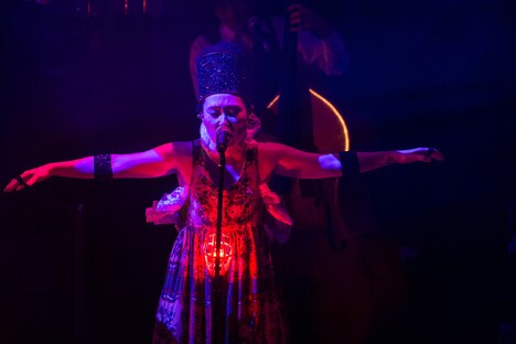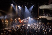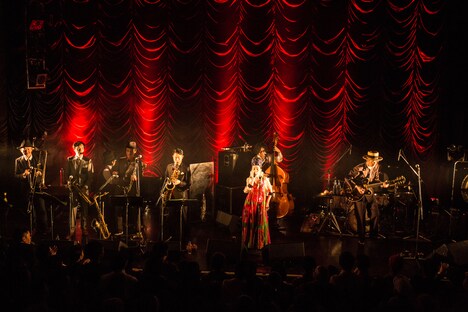 ジャジーなサウンドに乗せて中納が涼しげな歌声を聞かせる「Crazy Fruits」やルイ・ジョーダン「Choo Choo Ch'boogie」の軽妙洒脱なカバーなどでオーディエンスをクールダウンさせたのち、バンドは「GIGOLO」「あしながのサルヴァドール」「老いぼれ犬のセレナーデ」を続けて演奏。憂いを帯びたサウンドと中納の妖艶なボーカルが混ざり合い、場内にムーディな雰囲気がたちこめていく。ここで中納がステージから一旦捌けると、「趣味のコーナーなんですけど、大丈夫ですか?」という森の一言を合図にバンドはLlans Thelwell & His Celestialsのレアなインストスカ「Mughead Ska」を披露。ルーディなダウンビートがフロアを激しく揺さぶった。中納が再びステージに登場すると、軽快なスカのリズムが心地よい新曲が演奏され、続けて「A Love Song」が届けられるとオーディエンスは、ゆったりしたリズムとスウィートなメロディに身を委ねるようにして体を揺らしていた。