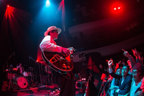 武嶋のむせび泣くようなサックスのイントロで幕を開ける「かつて..。」でライブは後半戦に。「色彩のブルース」をしっとりと届けると、中納が「しばし全部忘れてもらいましょうか!」とフロアに呼びかけ、ステージ後方の銅鑼を森が力強く打ち鳴らす。そこからライブはピークタイムに突入。バンドは「Mother Ship」「雨のdubism」「くちばしにチェリー」といったキラーチューンを怒涛のごとく畳みかけ、スリリングかつエネルギッシュなプレイでオーディエンスをクライマックスへと導いていった。本編最後の楽曲として彼らがチョイスしたのは開放的なポップチューン「love scene」。この楽曲では、ギターを弾く森の肩に中納が手をかけながら歌唱するという微笑ましいシーンも見られた。