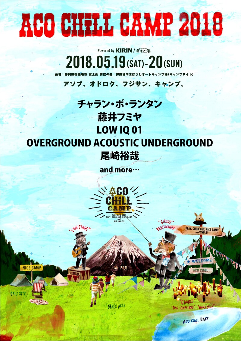 5月19、20日にライブイベント「ACO CHiLL CAMP 2018 powered by KIRIN / 富士山麓~アソブ、オドロク、フジサン、キャンプ。~」が静岡・富士山樹空の森と静岡・やまぼうしオートキャンプ場で開催される。