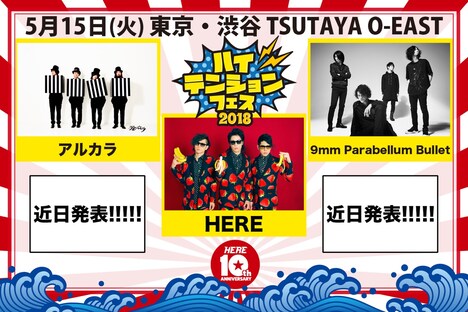 HERE結成10周年記念「ハイテンションフェス」に9mm Parabellum Bullet、アルカラ #HERE #9mm_Parabellum_Bullet https://t.co/bdTzJzX34i
