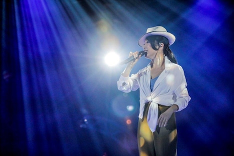 「September Blue Moon」のイントロが流れると、マタドールふうのピンクジャケットに身を包んだユーミンがステージに登場。1曲目を歌い終えると「38回目の苗場へようこそ! 今回はカーニバルだよ! 最後まで倒れないように付いて来てね!」と集まったファンに呼びかけた。ステージに腰を下ろしてしっとりと聴かせた「曇り空」のあとに披露したダンサブルなナンバー「Blue Rain Blue」では、ポンチョふうの衣装からゴールドのドレスに早変わりして観客を楽しませた。