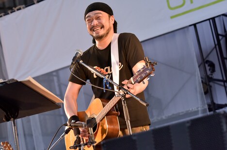 夕暮れ時に登場したのは竹原ピストル。今回の出演者で唯一のソロアーティストにして弾き語りのライブアクトである彼は「今日は仲間に入れていただいてありがとうございます。竹原ピストルと言います」と述べてから1曲目「よー、そこの若いの」を歌うと、彼自身を投影した歌を次々に披露して喝采を浴びた。