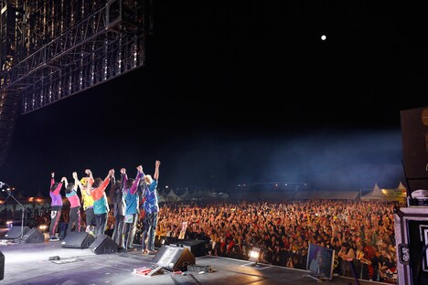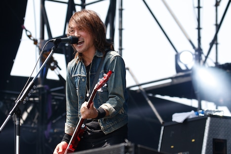 真っ青な空の下、この日のトップバッターとして現れたJは「あの人に届くように、無茶苦茶盛り上がって行こうぜ!」と開口一番にシャウト。「Go Charge」「Feel Your Blaze」などのアッパーなロックチューンを畳みかけ、ステージ一帯に熱狂的な空間を作り出す。また彼は「今日は某バンドの代表として来ました。やつらの曲をよかったら歌ってくれ」と呼びかけ、