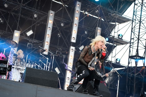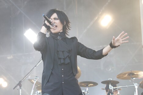 黒い衣装でまとめたdefspiralは、重厚なリフに乗せてTAKA(Vo)が力強くシャウトする「AURORA」、疾走感のある「PULSE」と連投し、序盤からオーディエンスを熱く盛り上げる。TAKAは「今日、大事なのはこの日を最高の最強の1日にすることです。お前ら、やっちゃってるかい?」と煽ってから、「嘘付き……」と、hideの「DOUBT」カバーを歌唱。defspiral流のダークかつ迫力のあるバンドサウンドで観客を魅了しつつ、hideへの尊敬と感謝の気持ちに満ちたステージを展開した。