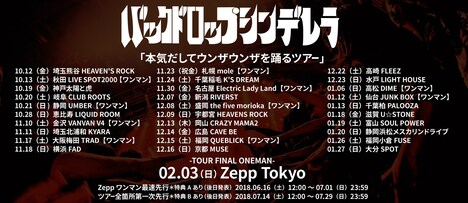 このツアーは本日5月29日に東京・渋谷CLUB QUATTROで行われた「バックドロップシンデレラ5th Single『サンタマリアに乗って』レコ発『サンタマリアとウンザウンザを踊るツアー』」最終公演で発表されたもの。次回ツアーでは10月12日の埼玉・HEAVEN'S ROCK Kumagaya VJ-1を皮切りに2019年2月3日の東京・Zepp Tokyoまでワンマンライブ11公演と対バンライブ20公演が行われる。このうちZepp Tokyoは彼らにとって過去最大規模となる会場。豊島”ペリー来航”渉(G, Vo)は最終公演に向けて「結成から12年間、ライブハウスで1200本以上のライブを重ねてきました。自分たちが今までやってきたことを信じて、日本で一番大きいライブハウスに挑戦します」と意気込みを語っている。