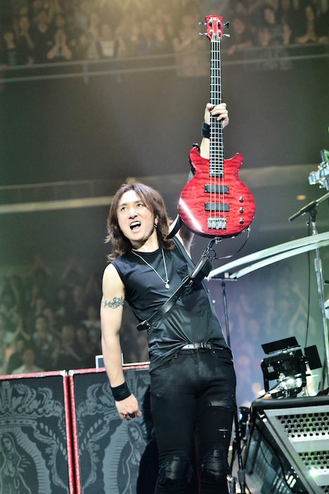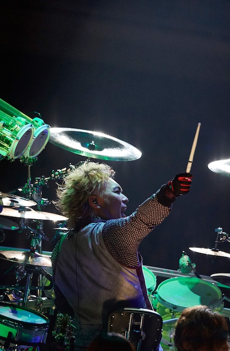 しかし、壮大で幽玄な景色を描き出す「gravity」を経ての「闇火」で場内の空気は一転。INORANがアコースティックギターをつま弾き、SUGIZOがバイオリンを奏でる中、RYUICHIは感情を抑えるように歌い出す。その声は次第に緊迫感を帯び、Jと真矢が演奏に加わりサウンドが一気にヘビーになるにつれて激情をにじませた。同時にステージの後方に立てられたトーチからは炎が吹き上がり、エモーショナルな楽曲の世界を彩っていた。その後、RYUICHIの歌とそれに寄り添うSUGIZOのバイオリン、INORANが弾くアコースティックギターの調べが溶け合った「I for You」が会場の空気を和らげ、さらに真矢のドラムソロ、Jのベースソロと続いていく。リズム隊の2人は貫禄あるプレイと、熱いシャウトを繰り出し、それぞれのスタイルでプレイヤーとしての一面をアピールした。