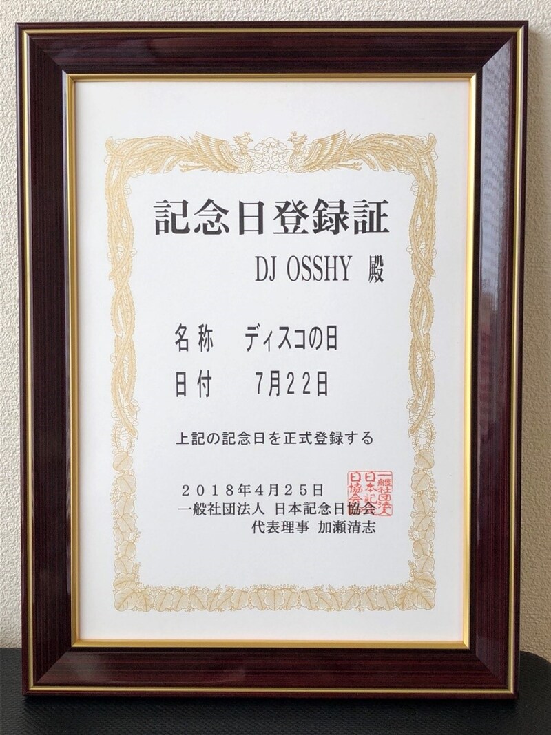 DJ OSSHYの申請を受けて、日本記念日協会が7月22日を「ディスコの日」として登録した。