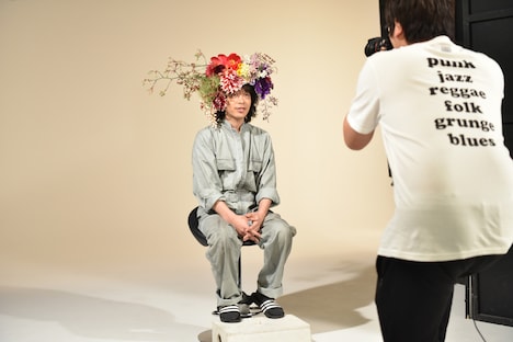 撮影現場には30種類もの生花が持ち込まれ、峯田は重い特殊なネットを頭にかぶり、生花の茎をネットに絡ませるように生け花の形が作られていった。石原は“頭で生け花をされている峯田”とは対照的な、名門華道家らしい凛とした表情で撮影に挑んだ。
