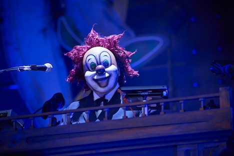 DJ LOVEの煽りに合わせての手拍子が響き渡った「RPG」が終わると、Nakajinのアコースティックギターが緊張感を誘う「Death Disco」へ。日没を迎えた会場の空気は一変する。「MAGIC」のあとは「皆様、昼のショーはお楽しみいただけましたでしょうか? ここからは夜のショーが始まります」という座長のナレーションが流れた。そして「炎と森のカーニバル」のイントロとともにステージ上のネオンが一斉に灯り、機関車からは大きな炎が上がった。後半の幕開けを告げる華々しい演出に、客席からはすさまじいどよめきが起こった。
