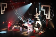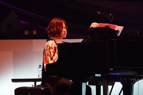 ツアー開幕戦の舞台となった舞浜アンフィシアターの円形ステージには、梶浦のグランドピアノを囲むように、バンドメンバーの是永巧一(G)、佐藤強一(Dr)、高橋“Jr.”知治(B)、城元絢花(Violin)、赤木りえ(Flute)、大平佳男(Manipulator)、そしてボーカリストのKAORI、YURIKO KAIDA、ASUKA(結城アイラ)がスタンバイ。円形に張り出した舞台の中央にもう1人のボーカル・Joelleがせり上がってくると、2000人を超える観客から大きな歓声が沸いた。ボーカルは曲によって2人、3人、4人とフォーメーションを変えて展開し、さらに「lotus」ではこの日のゲストボーカル・戸丸華江が登場。凛としたハイトーンでバンドアンサンブルを華やかに彩った。