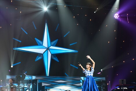 水瀬が赤い衣装に身を包んで披露した「Million Futures」では客席からコールが飛び、会場が1つに。さらに「星屑のコントレイル」を大人っぽい表情で歌い上げた水瀬は、「三月と群青」のアウトロで青のチェック柄衣装に早着替えし、「アルペジオ」を歌唱。「月」や「星」といったワードが登場するこの曲では、星空をイメージした照明がステージを照らした。また「Happy Birthday」では曲中に水瀬が「おめでとう!」と7月生まれのファンを祝う場面も見られた。