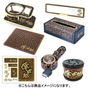 「倖田組DRIVINGグッズ」は全7種類。上質な香りが車内を満たす芳香剤をはじめ、ルームミラー、ドリンクテーブル、ティッシュケース、携帯電話充電器などの定番アイテムが用意されている。デザインはすべて、くぅちゃんこだわりのヒョウ柄×ゴールドだ。