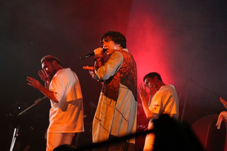 三浦の呼び込みから、いよいよ大トリを飾るKREVAのステージがスタート。1曲目「アグレッシ部」で盛大なシンガロングを巻き起こした彼は、客席を眺め「最っ高だな!」と笑顔を見せた。続く「ひとりじゃないのよ」では高畑と共にステージを端から端まで練り歩き、ファンとの距離を縮めていく。最新作「存在感」から「俺の好きは狭い」を披露したあとは、「イッサイガッサイ」から始まる怒涛のメドレーへ。高速ラップが炸裂する「基準」や炎の演出でオーディエンスを煽り続け、メドレーを締めくくる2回目の「イッサイガッサイ」で場内の熱気を最高潮へと導いた。この日の出演者たちがステージに集合するとKREVAは「全員で、今日ここにしかない音色を一緒に重ねてみましょうか」と声をかけ、彼らと共に「音色」を届けて本編を終えた。