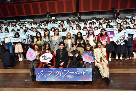 E-girlsは11人そろって本作を鑑賞したそうで、鷲尾は「切なくも温かい気持ちになれるラブストーリーだなと思いました。お二人を取り巻いている環境がものすごく考えさせられることがたくさんあって、その中で生まれる愛や思い合う気持ちは当たり前のようで当たり前じゃないなと感動しました。タイトルの『パーフェクトワールド』という言葉の意味が、どんな環境でも2人の愛があればそこは“パーフェクトワールド”なんだなと改めて思いましたね。素敵な作品に関わることができて感動しています」と映画の感想を語る。藤井夏恋は「ワンシーンワンシーンがキュンキュンさせられて、メンバーと隣同士で話したくなる作品だなって。この作品を観て本当の愛とはこういうものなのかと思いました。いつか私たちも本当の愛というものをつかめるようにがんばりたいなと思いました」と話し、佐藤晴美は「まだつかめていないようですね(笑)」と笑った。原作マンガを読んでいたという武部柚那は「自分が読んでいたマンガ(原作の映画)の主題歌をやらせていただくのは不思議な気持ち。映像で観るとマンガ以上に伝わるものがありますね。エンドロールで私たちの歌が流れていち視聴者として聴き入ってしまいました」とコメントした。