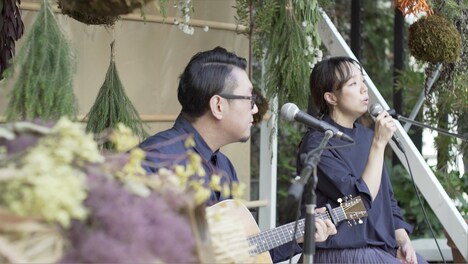 ビューティフルハミングバードは秋空に映える「眩しい季節のなかへ」や雨上がりの風景にマッチする「傘」などをパフォーマンス。MC中に2人はヒューガルデンで乾杯し、小池光子(Vo)は「なんていい仕事なんでしょう!」と至福の表情を浮かべる。続けて「ただ、困ったことにビールを飲みながら歌うと気持ちよくなるけど、ゲップが出そうになってしまうから大変」と切実な悩みを吐露し、来場者を笑わせた。