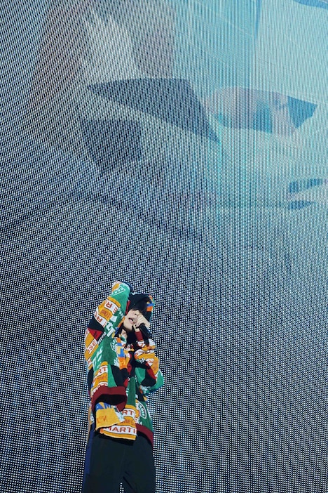 米津はピースサインを掲げながらメインステージへと戻り、「まだまだ行こうぜ!」と声を上げてロックチューン「ピースサイン」を披露。10月31日にリリースする両A面シングル「Flamingo / TEENAGE RIOT」の表題曲の1つ「TEENAGE RIOT」が演奏された際には、同曲のミュージックビデオがビジョンで上映され、観客は生パフォーマンスと同時にMVも鑑賞する形となった。ここまで12曲をぶっ通しで披露した米津は「元気? 人がすごいね」とようやくMCらしいMCを実施。「TEENAGE RIOT」の感想を「みんな、どうだった?」と観客に問い、大歓声が湧き上がると「よかった! すげーうれしい」とはにかんだ。