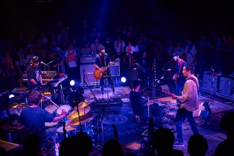 「アルバムタイトル曲を初めて披露するから。すごい練習したもんね」という後藤の紹介から、12月5日にリリースされるニューアルバムの表題曲「ホームタウン」を奏で出したメンバーたち。躍動的なリズムとメロディアスなベースを中心にしたシンプルなアンサンブル、後藤が朗々と歌い上げるナンバーを観客は楽しげに聴き入る。後藤とシモリョーのハーモニーで始まる「スリープ」に続き、今度は「ホームタウン」に収録されているシングル「荒野を歩け」に。大サビで大きなクラップが起き、フロアの中心でプレイする5人を包み込んだ。