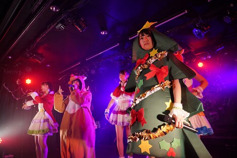 その後彼女たちは、ポップな「フユトテトテ」、ハードなダンスチューン「エンジェル演じて20年」、弾けるようなアップチューン「ハッピースLOVE▽」と、カラフルな楽曲を披露していく。クリスマスイベントにちなみ、アプガ(2)は、先輩グループ・