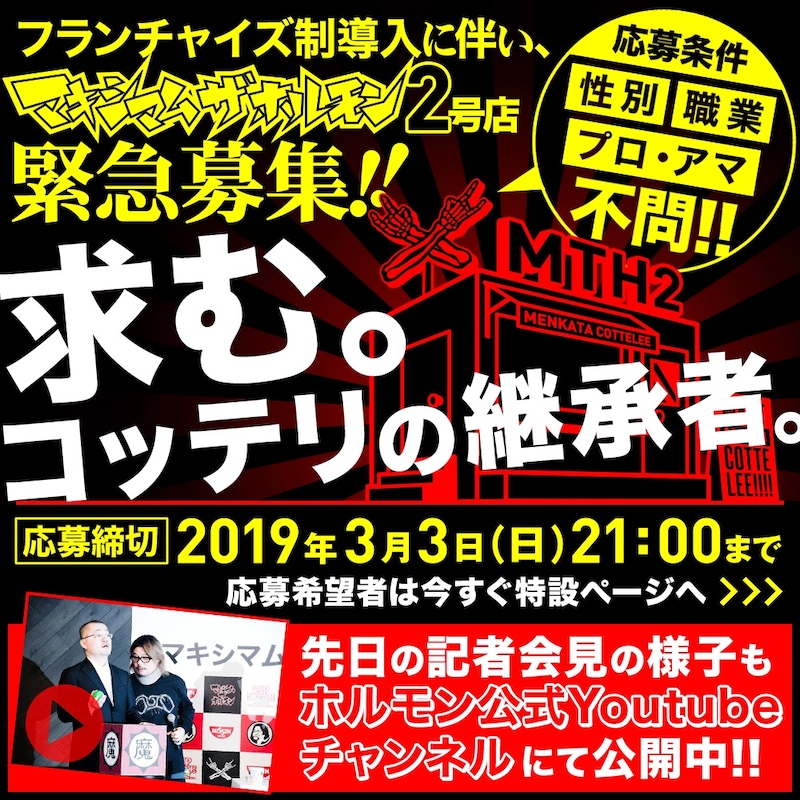 マキシマム ザ ホルモンは記者会見の中で、バンドの多角化を狙う一手として「“本店”であるマキシマム ザ ホルモンのスピリットを受け継ぐ“2号店”を新たに作る」ことを宣言した。“2号店”は5月5日に埼玉・さいたまスーパーアリーナで行われる「VIVA LA ROCK 2019」へ出演することがすでに決定している。“2号店”のメンバーは“本店”のメンバーにいないオリジナルパートでも応募できるとのこと。募集は本日2月25日から3月3日21:00まで、専用ページにて受付中。