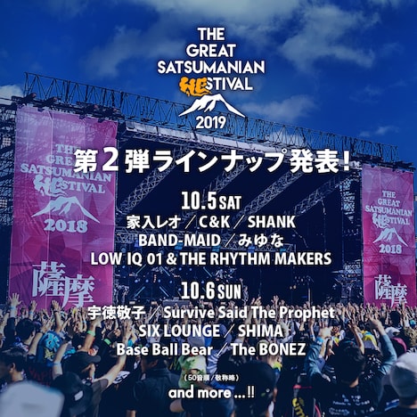 10月5、6日に鹿児島・桜島多目的広場&溶岩グラウンドで行われる野外ロックフェスティバル「THE GREAT SATSUMANIAN HESTIVAL 2019」の出演アーティスト第2弾が発表された。