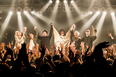 そんな中「上海姑娘」では、志磨が小型の銅鑼を叩き鳴らしつつ、ブラスサウンドに乗せて伸びやかな歌声を響かせる。演奏メンバー全員によるソロ回しで観客を沸かせた「贅沢とユーモア」で再びフロアを温めたのち、ラストナンバー「ニューエラ」終盤では有島のノイジーなギターソロをバックに1人ずつ退場。混沌とした“世界の終わり”を表現するように本編は締めくくられた。