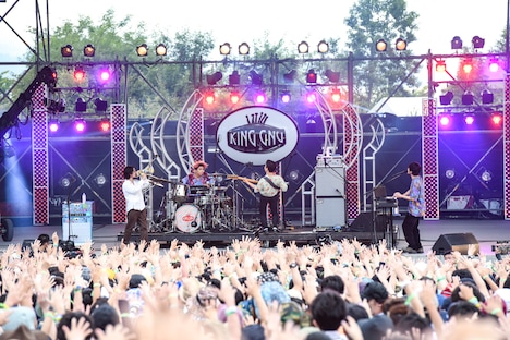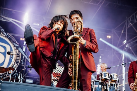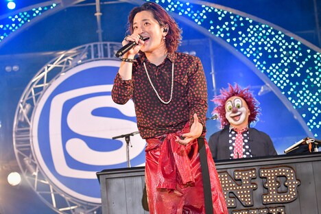 激しいサウンドで会場を盛り上げていたのは10-FEET。彼らはパワフルな演奏とメッセージ性の強いMCでオーディエンスを魅了した。TAKUMA(Vo, G)は登場するなり「10-FEET始めます!」「ありがとうございました10-FEETでした!」というおなじみの挨拶で来場者の笑いを誘う。「RIVER」では、TAKUMA が“河”という歌詞を“山中湖”と歌うなど、この日ならではのサービスでもファンを楽しませていた。今年デビュー30周年を迎えた東京スカパラダイスオーケストラは、「星降る夜に」ではOfficial髭男dism、「Wake Up!」ではASIAN KUNG-FU GENERATIONの後藤正文(Vo, G)、「閃光」では10-FEETのTAKUMA(Vo, G)をゲストに招いて会場を大いに盛り上げた。さらにスカパラのステージには、事前に告知されていなかった