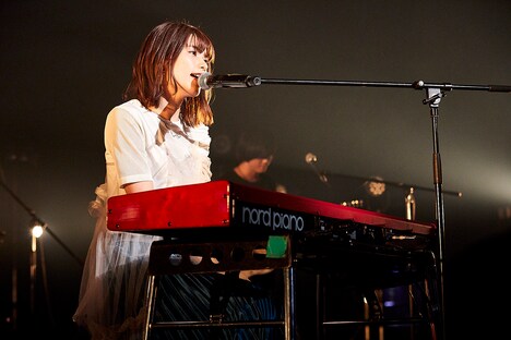 続いてのブロックで足立は、一途な恋心を歌った「私今あなたに恋をしています」や「ウタコク」、自分への応援歌「フレーフレーわたし」などタイプの異なる楽曲を歌唱。「ひとりよがり」では、マイクを握り締めエモーショナルな声を会場中に響かせた。ライブの折り返しに入ったタイミングでキーボードが運び込まれ、足立はその前に座り「私へ。」を弾き語り始める。観客は、彼女の凛とした歌声にじっと聴き入り、曲が終わると万雷の拍手を送った。